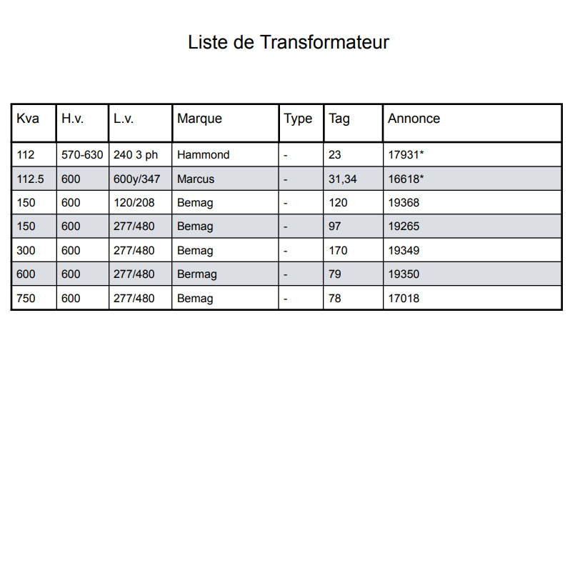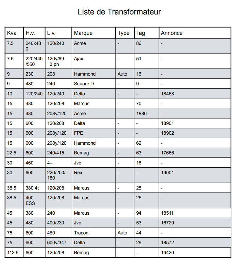 Liste de transformateurs Mise à jour le 09 Janvier 2026