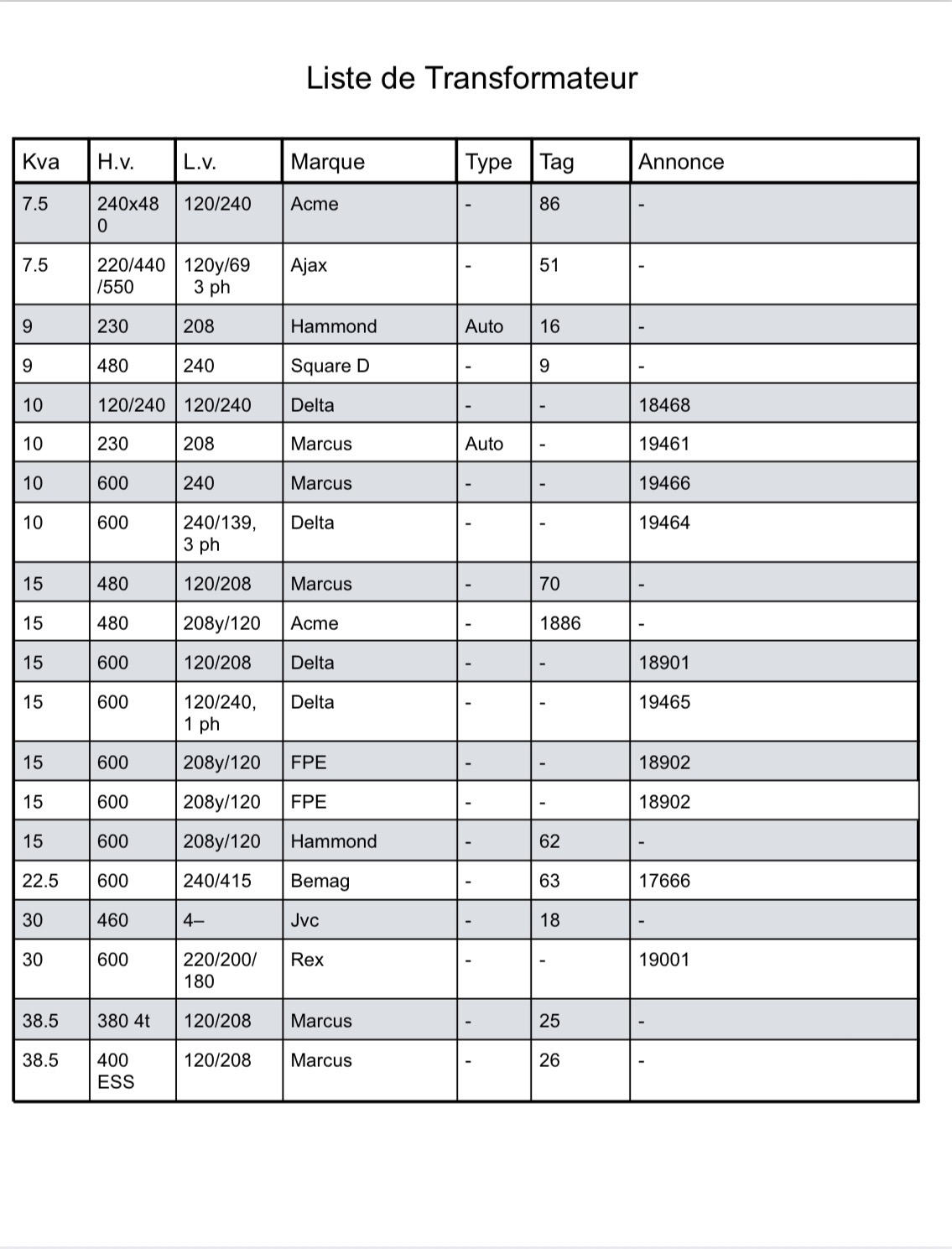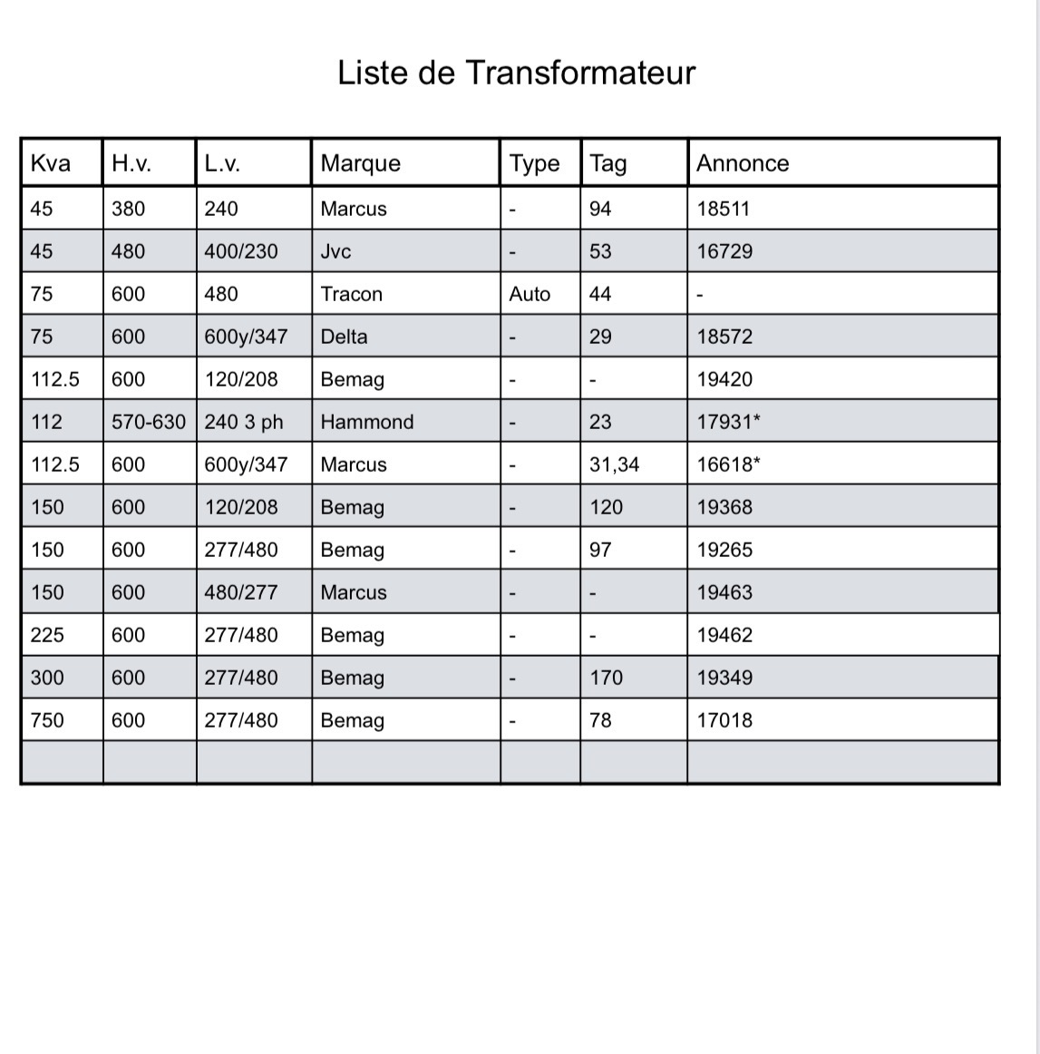 Liste de transformateurs Mise à jour le 25 Février 2026