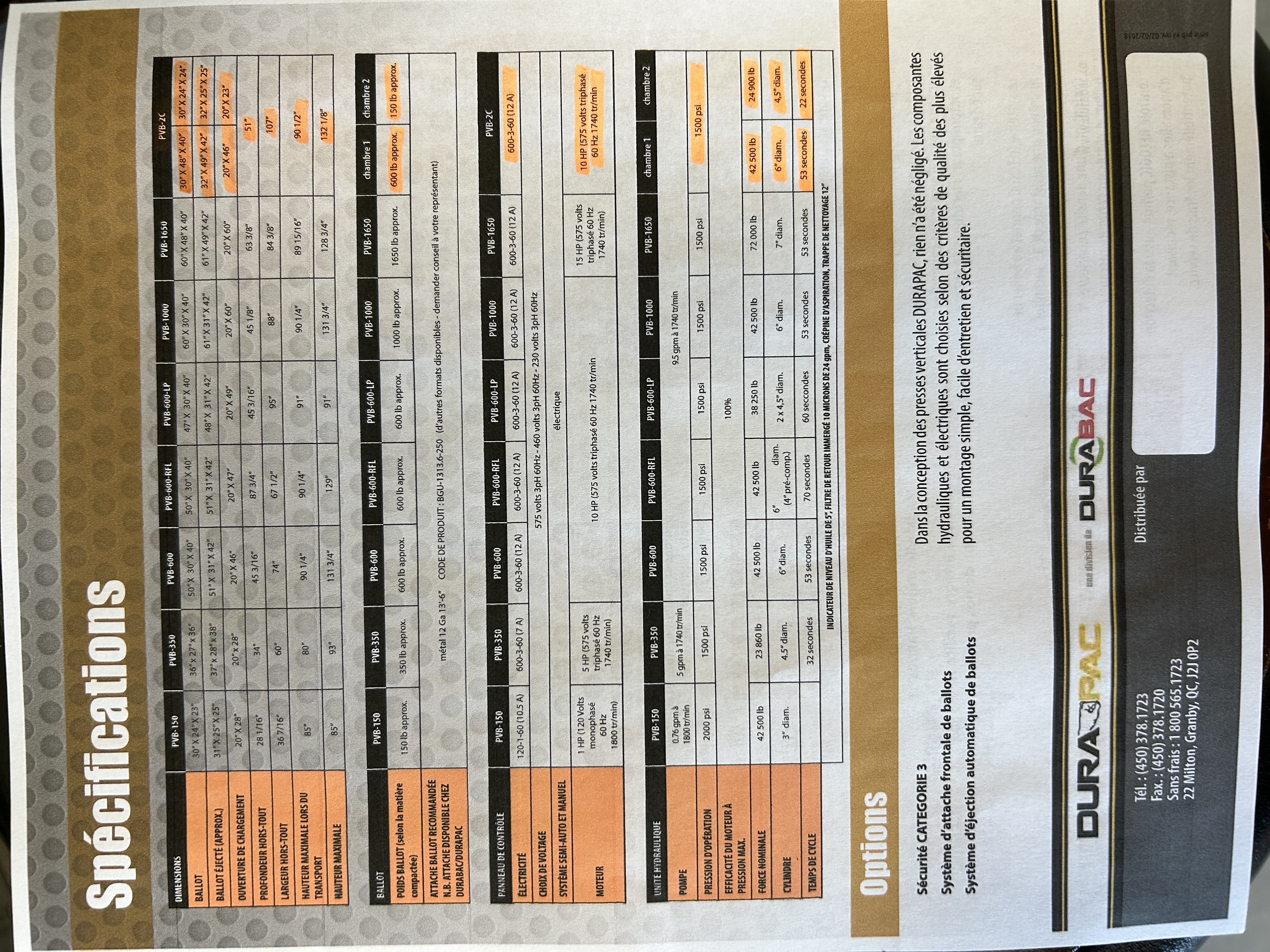 Compacteur double/ Presse à carton 10 hp, 600v Dimension extérieur hors tout: 47 po x 104 po x 89 po 1/2 de hauteur, Dimension intérieur des compartiments: - 47 po x 31 po, - 24 po x 31 po,