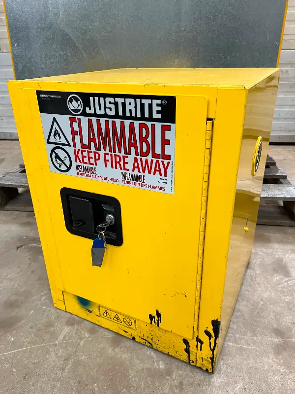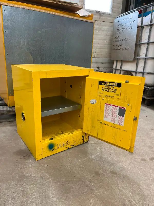 Armoire de sécurité de marque Justrite. Capacité: 4 gallons, 15 litres. Dimensions extérieur: 17" de largeur, 17" de profondeur et 22 1/2" de hauteur. Dimensions intérieur: 13 1/2" de largeur, 14" de profondeur et 18 1/2" de hauteur. 2 Clés incluses.