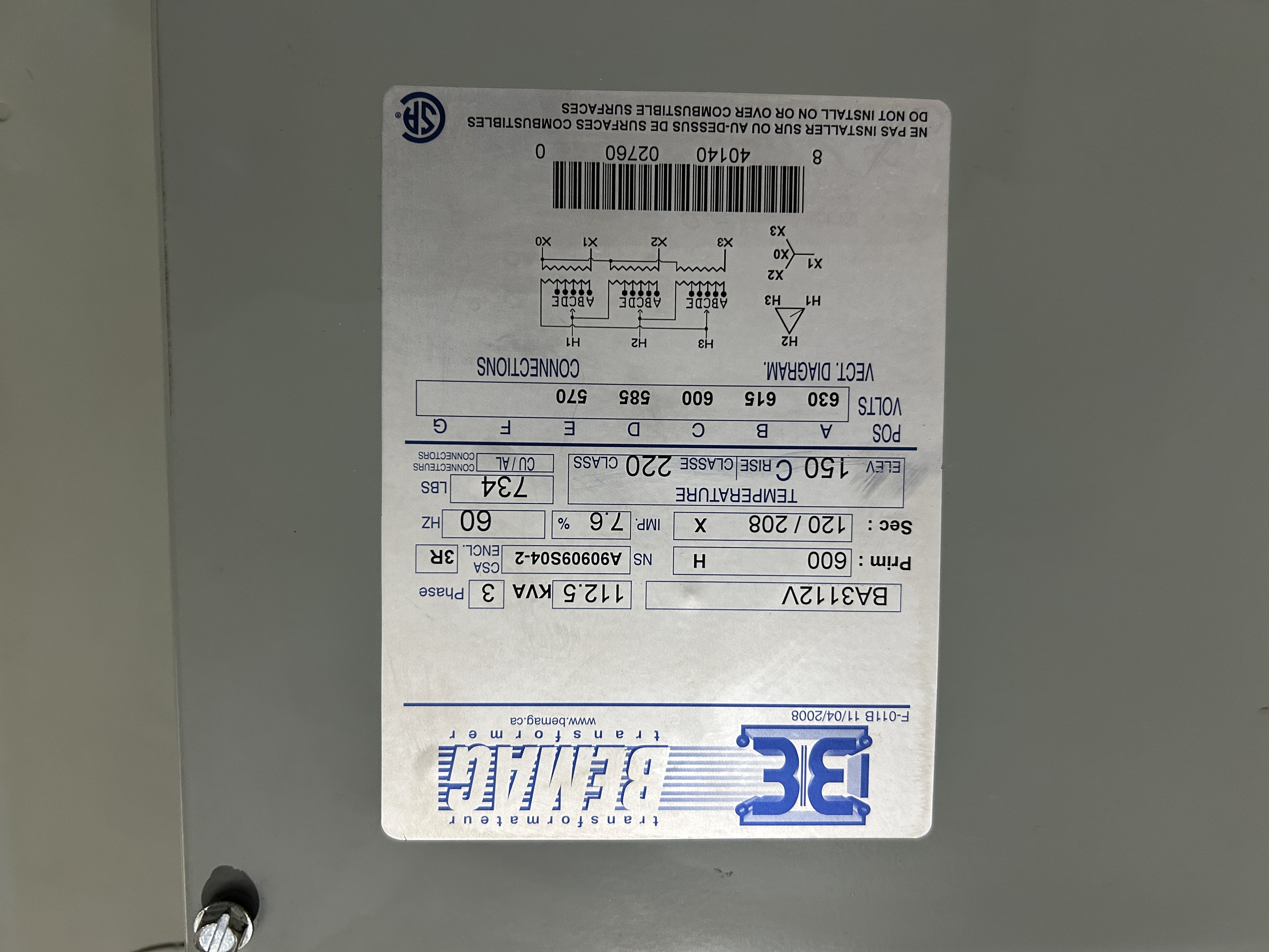 Transformateur 112.5 kva 600, 120/208 Bemag et sectionneur 200 ampère avec fusible
