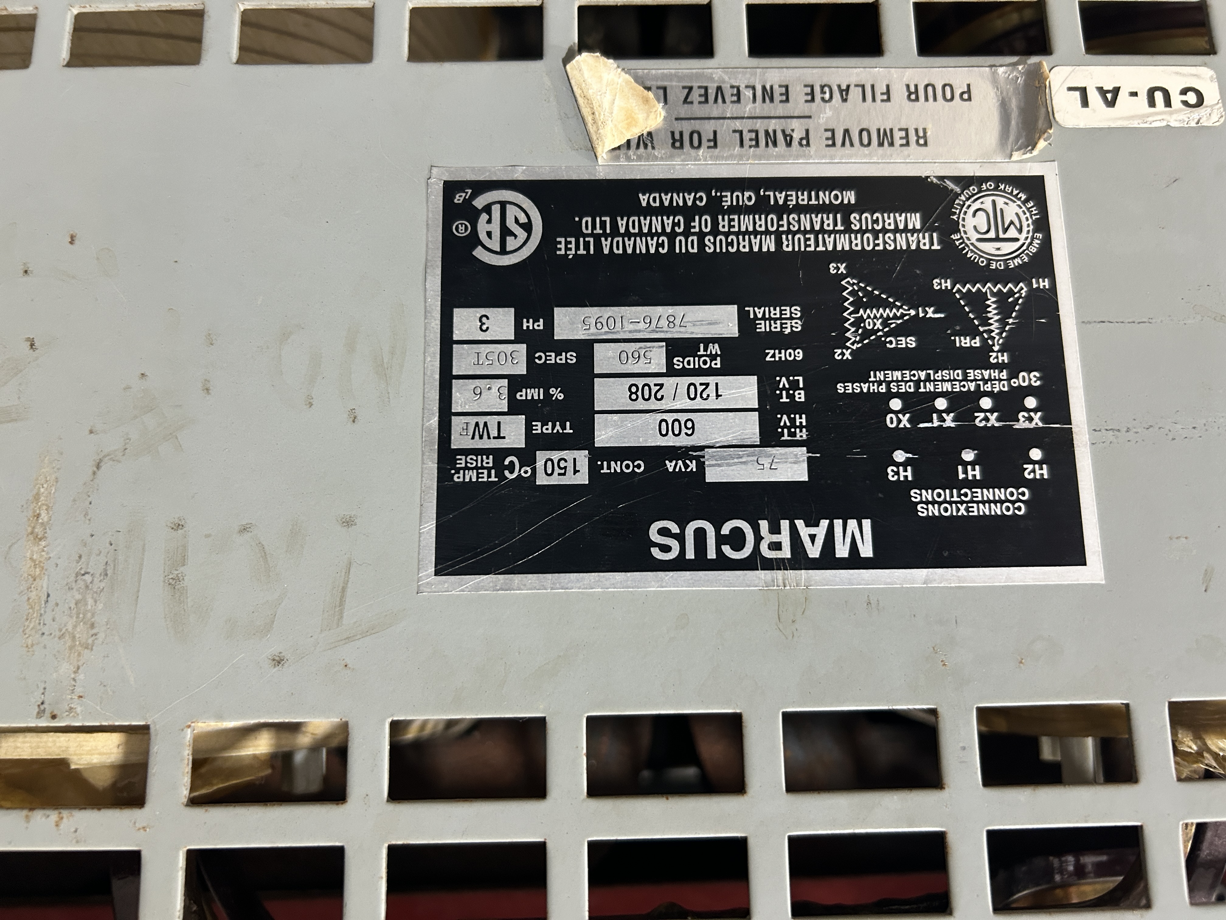 Transformateur 75 kva 600, 120/208 Marcus et sectionneur 100 ampères sans porte-fusible