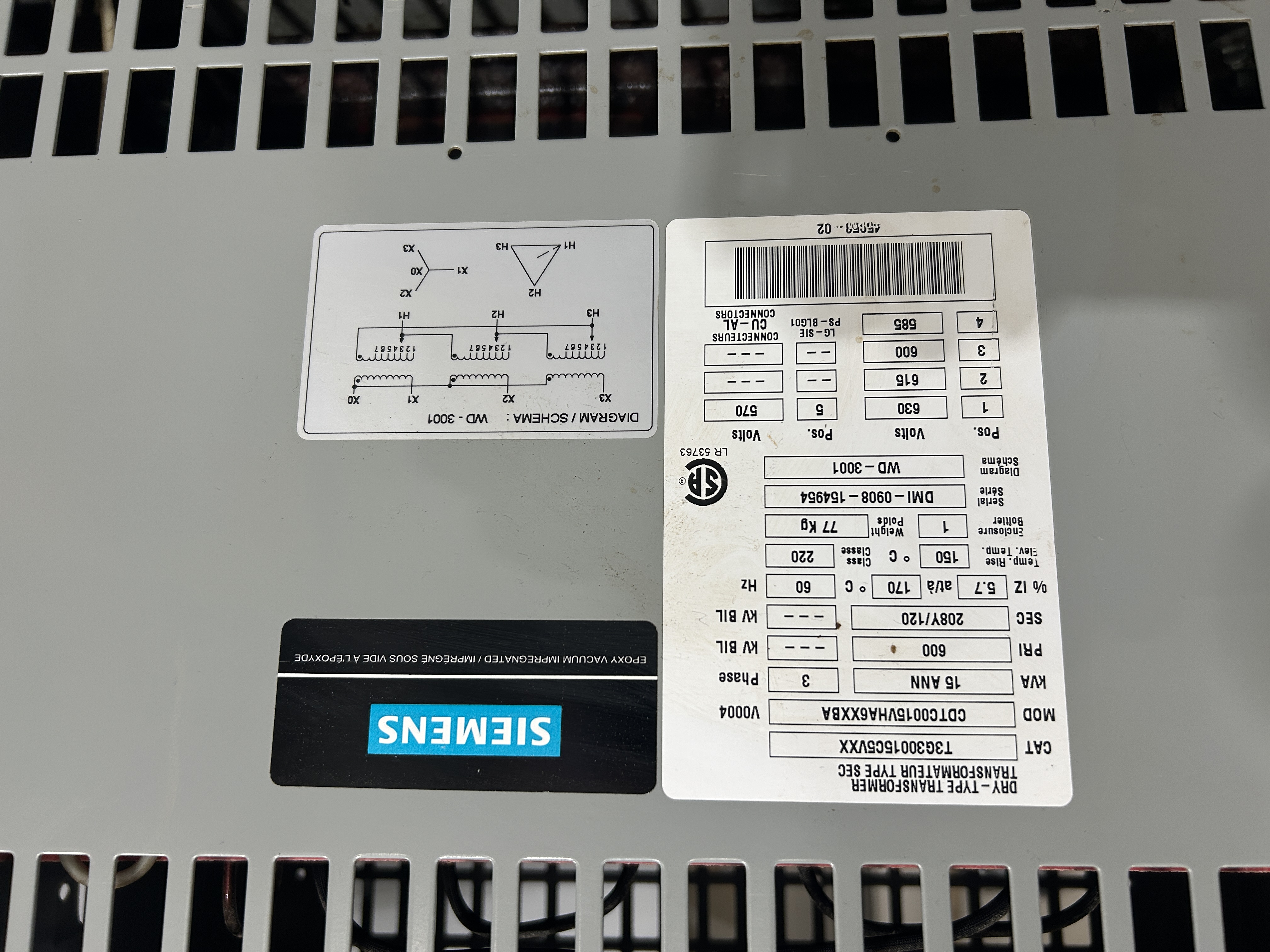 Transformateur 45 kva 600, 208y/120 3 ph Siemens