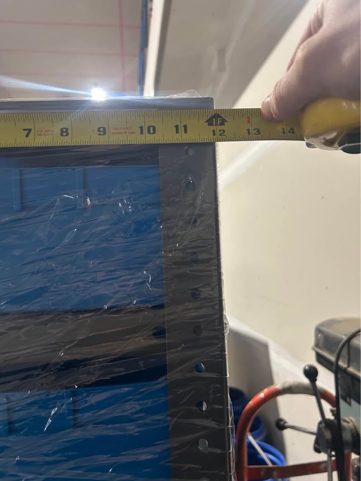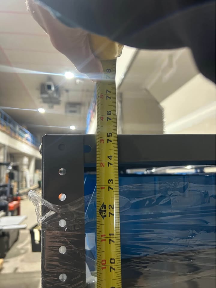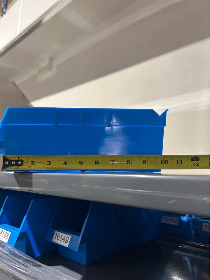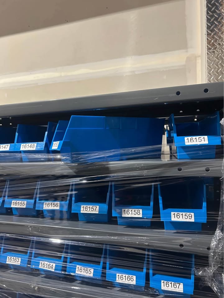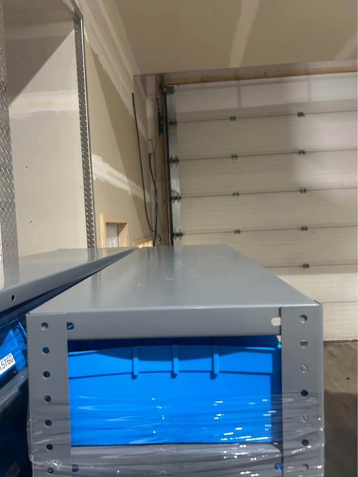 Étagères en métal avec bacs plastique. Dimension: 12 po x 36 po x 75 po avec 96 bacs de rangement bleus (12 pox 8 po). On peut les vendre montées ou démontées selon votre choix. Prix: 275$/ch ou 250$/ch pour 4 et plus.