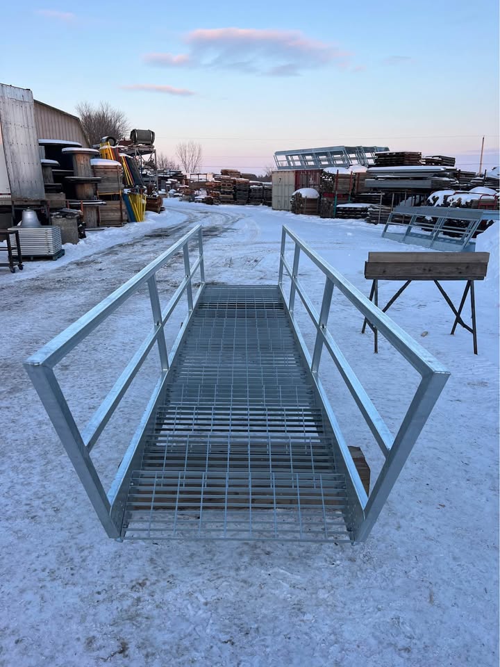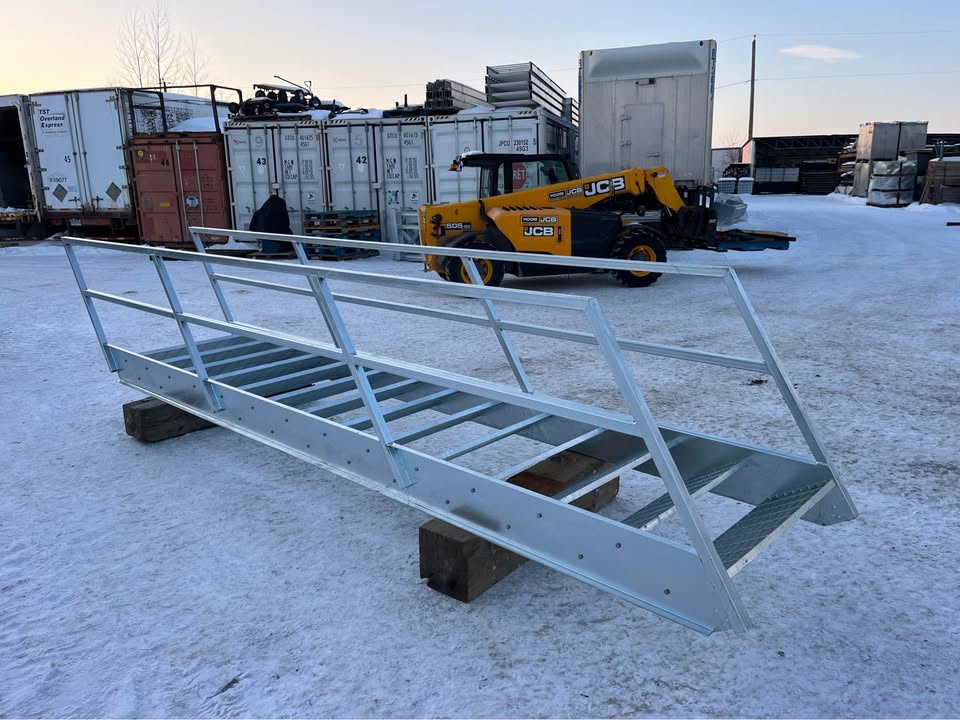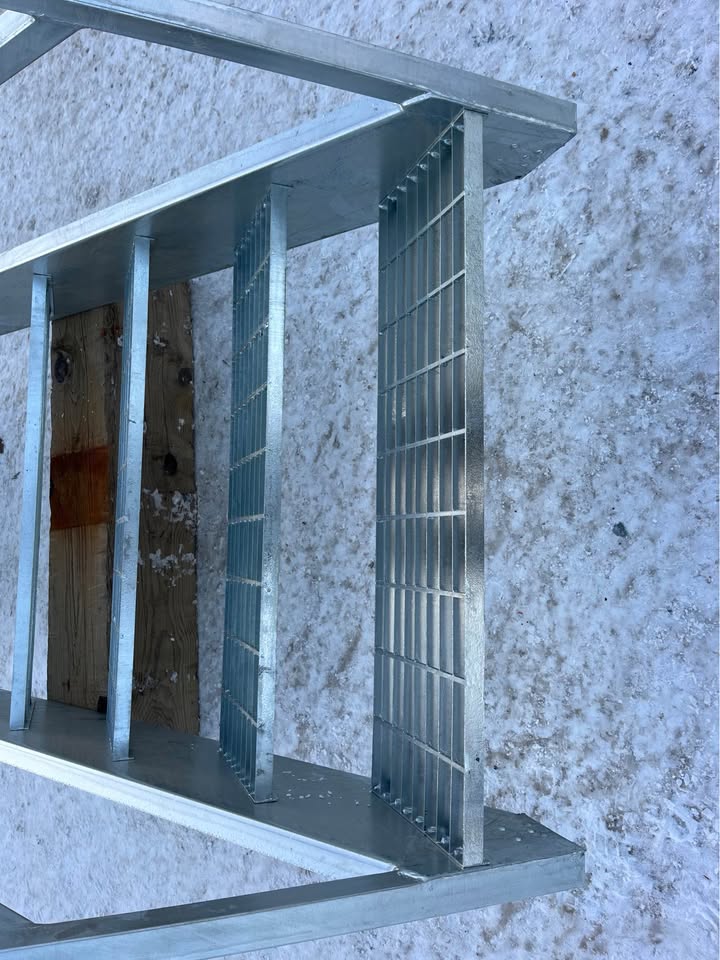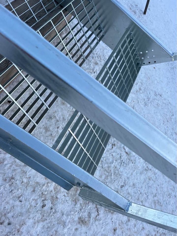 Escalier galvanisé neuf avec marches en caillebotis. Idéal pour l'extérieur. 14 marches de 11" de profondeur x 36 pouces de large. Pour une élévation de 8 pieds (7 pouces par marche). 2 garde-corps. Possibilité de l'acheté démonté (14 marches + 2 montants avec garde de corps) pour 1475$. 1575$ monté.