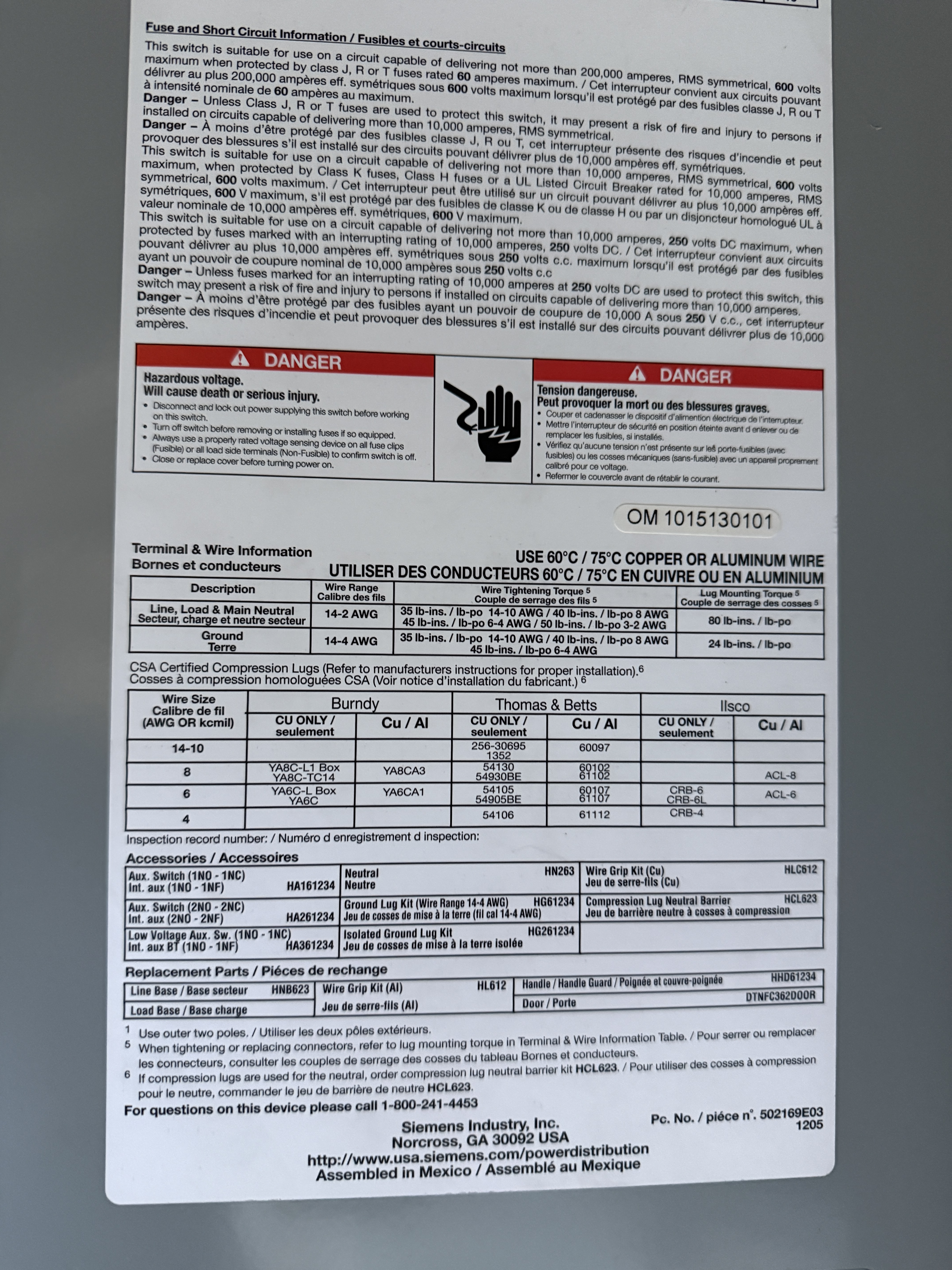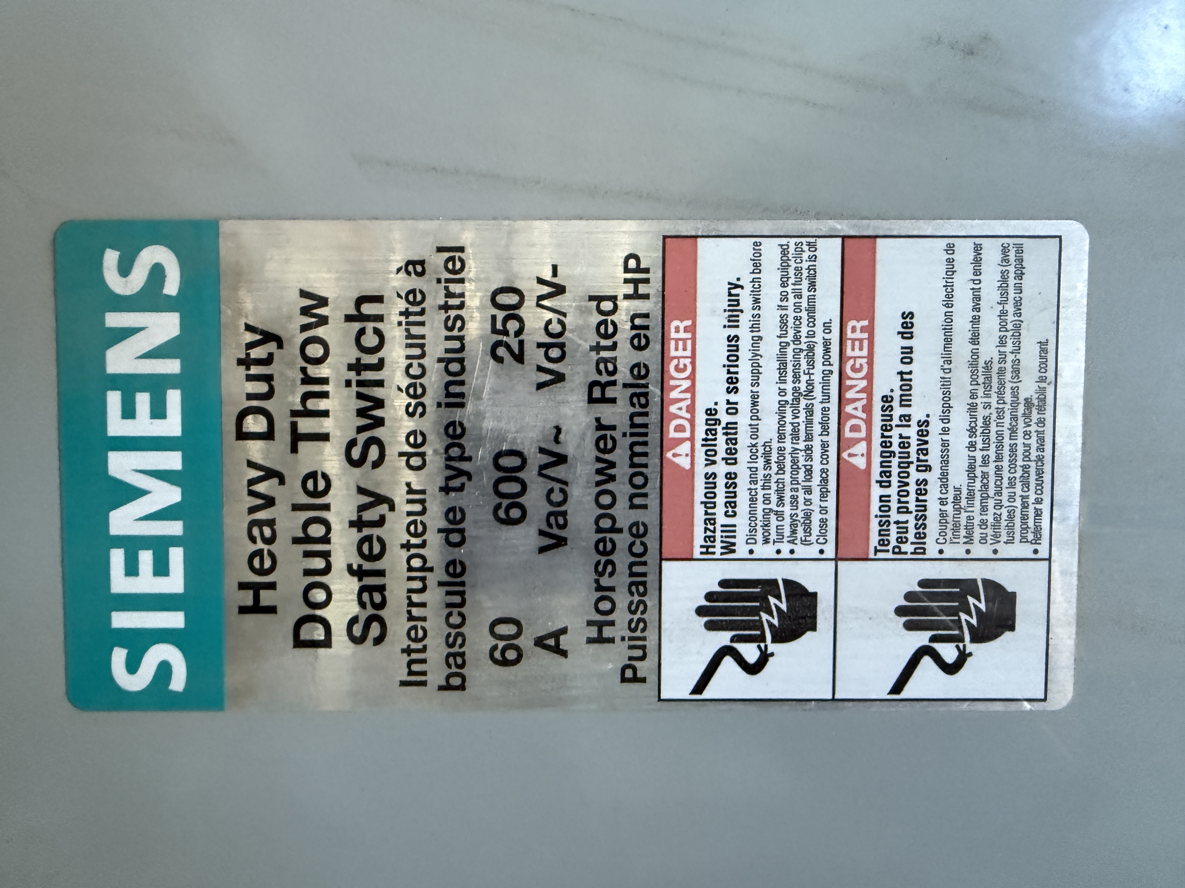Interrupteur de sécurité à bascule 60 amp, 600 volt ac / 250 dc