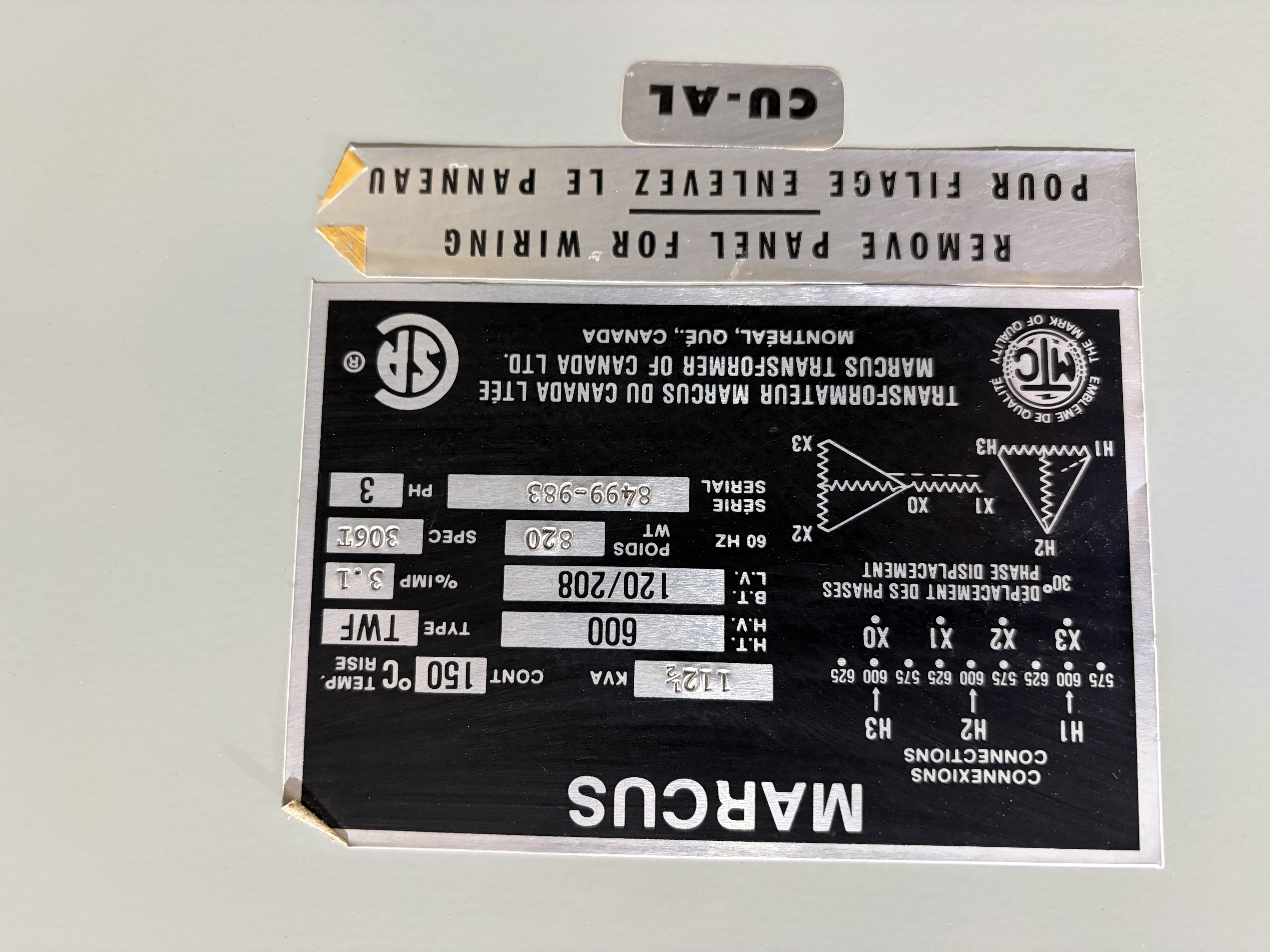 Transformateur Marcus 112.5 kva 600, 120/208, 3 ph