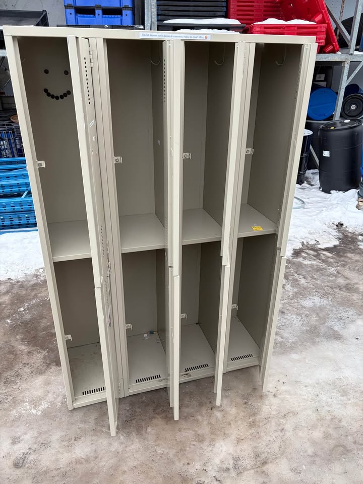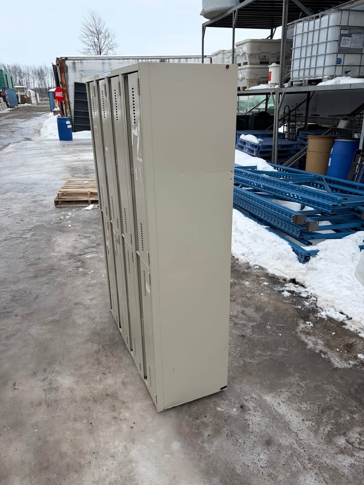 Casier vestiaire 8 demi-portes beige usagé. Dimensions: 18 pouces de profond x 48 pouces de larges X 72 pouces de haut