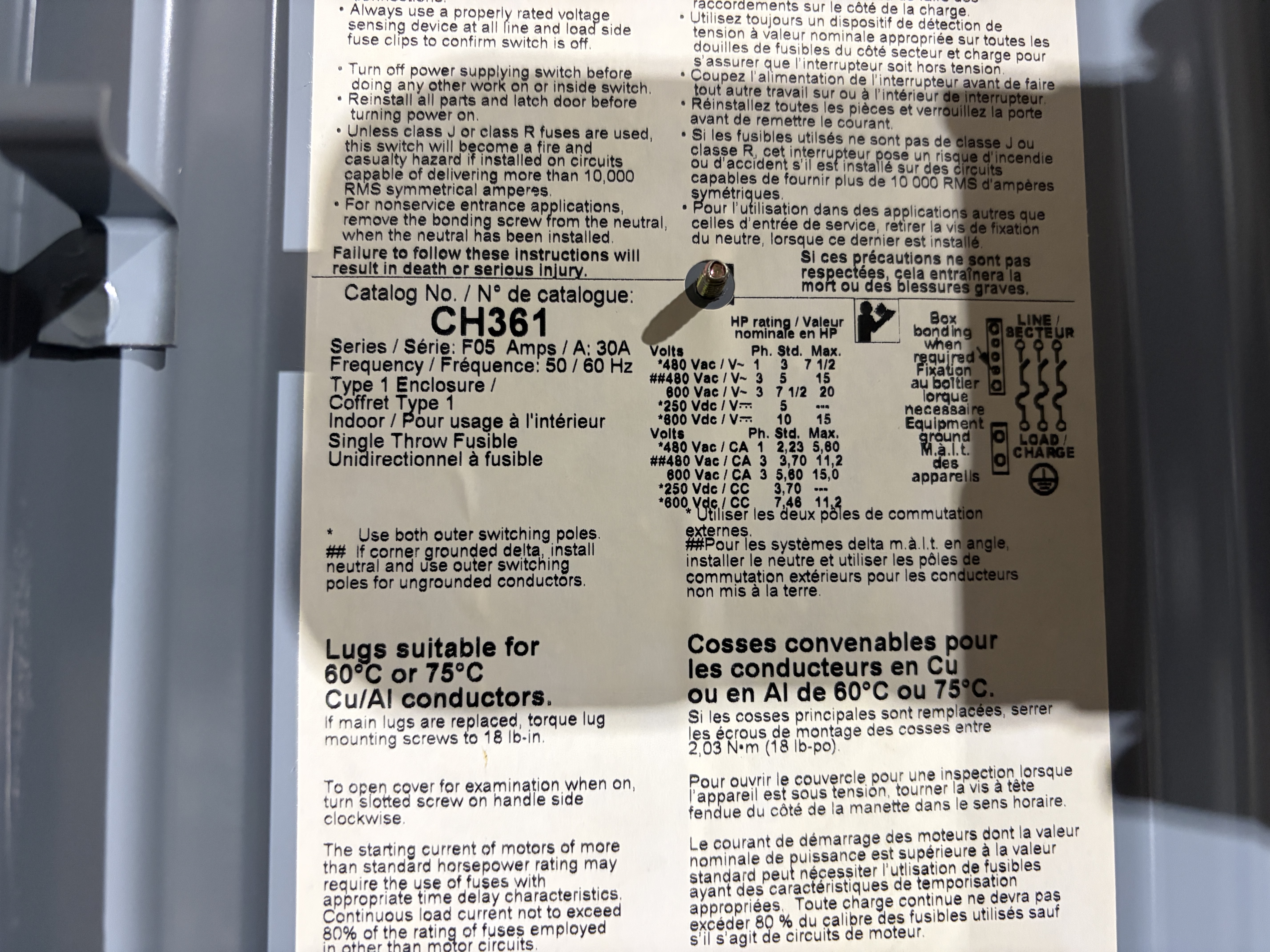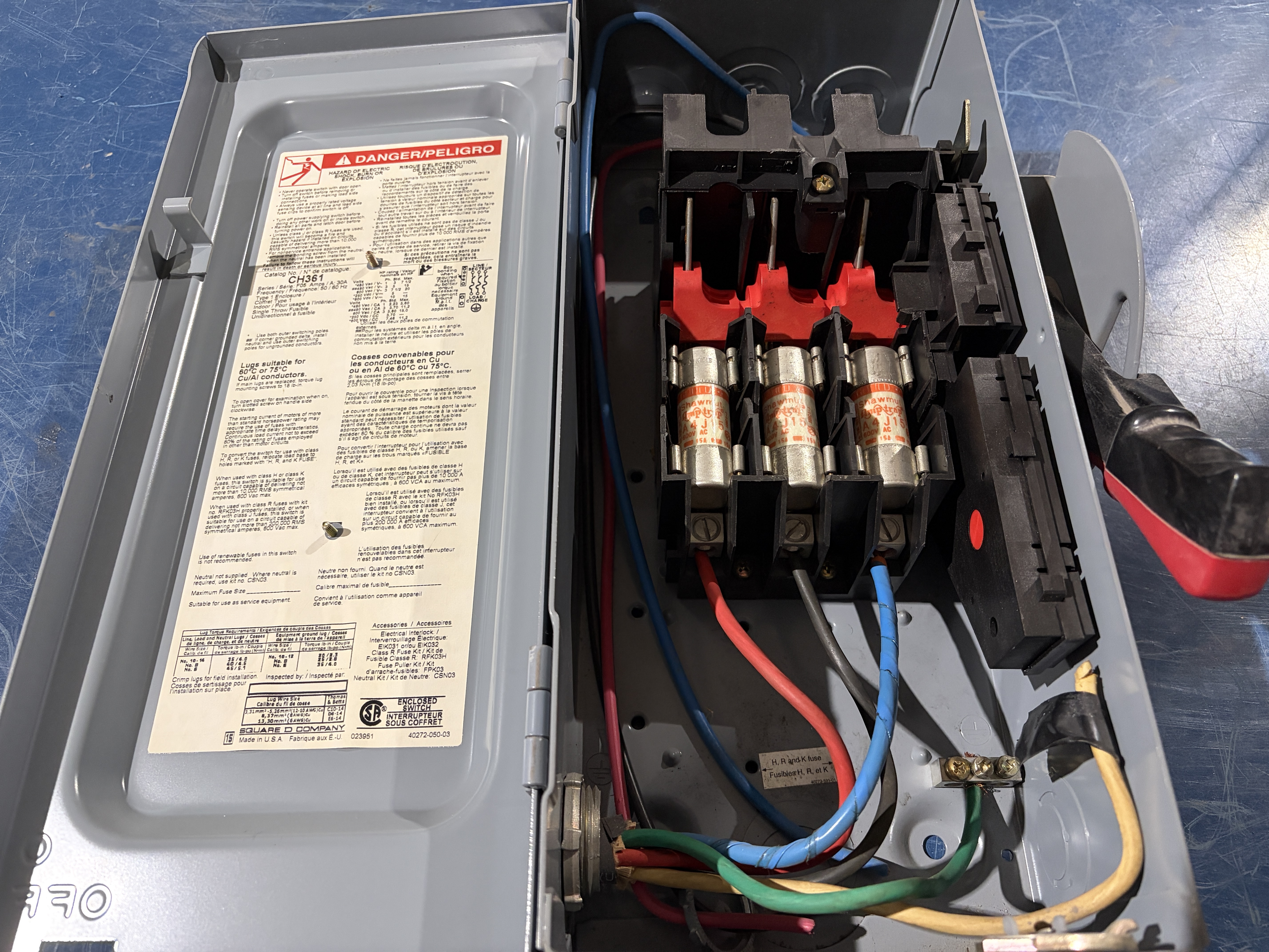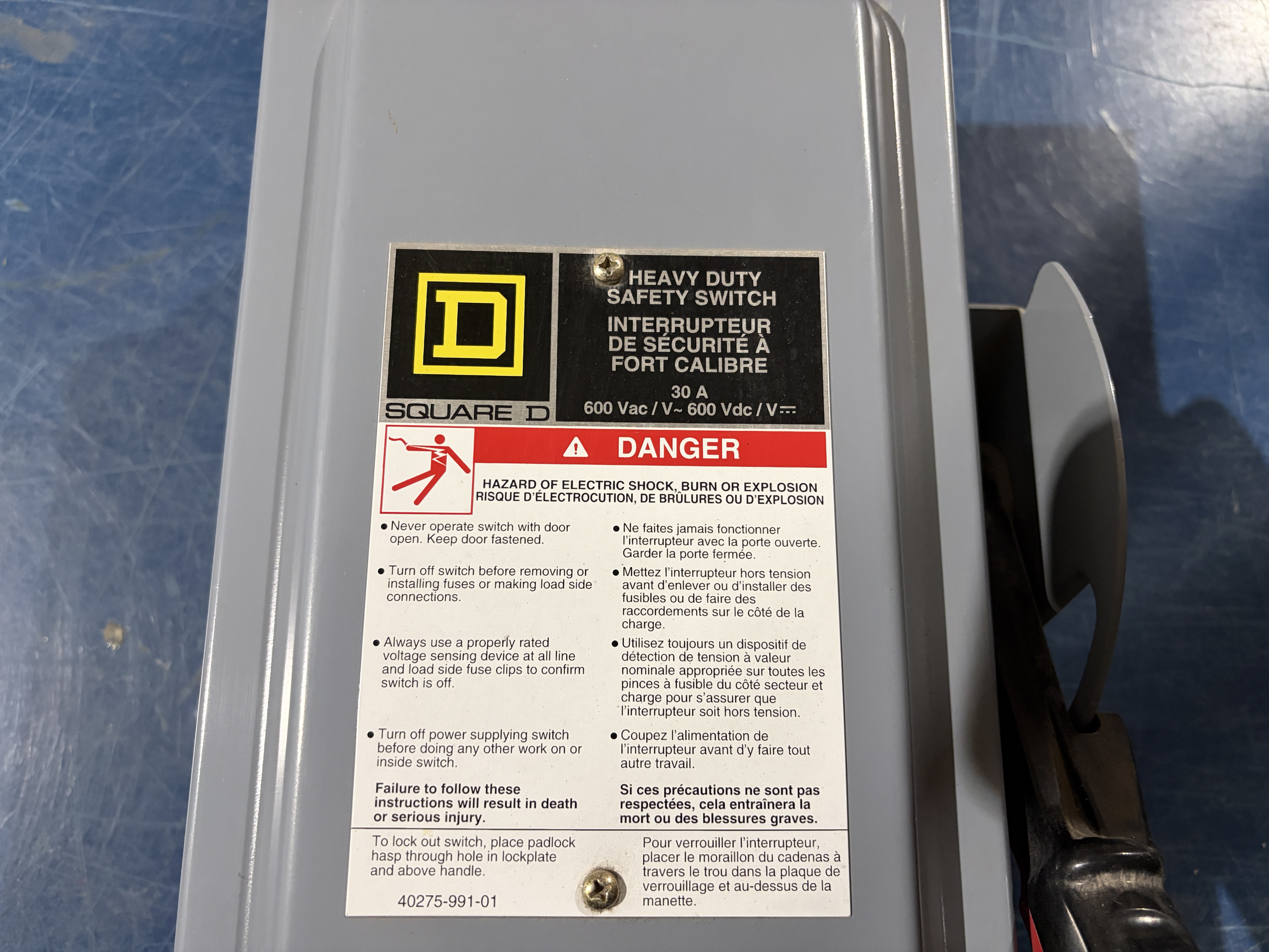 Interrupteur de sécurité 30 ampères 600 volt. Marque: Square D