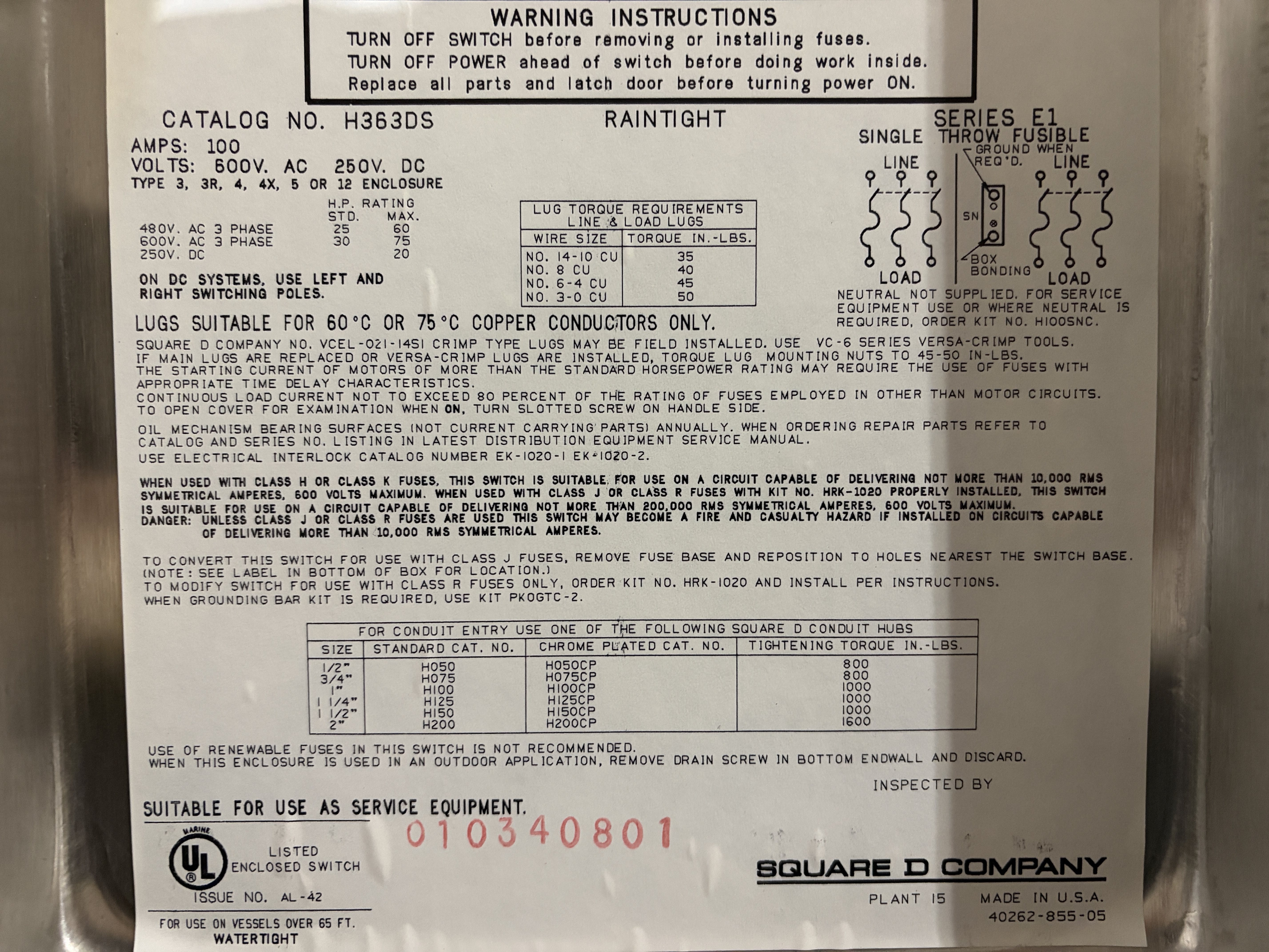 Interrupteur de sécurité 100 ampères, 600 volts Marque: Square D, Cat. H363DS