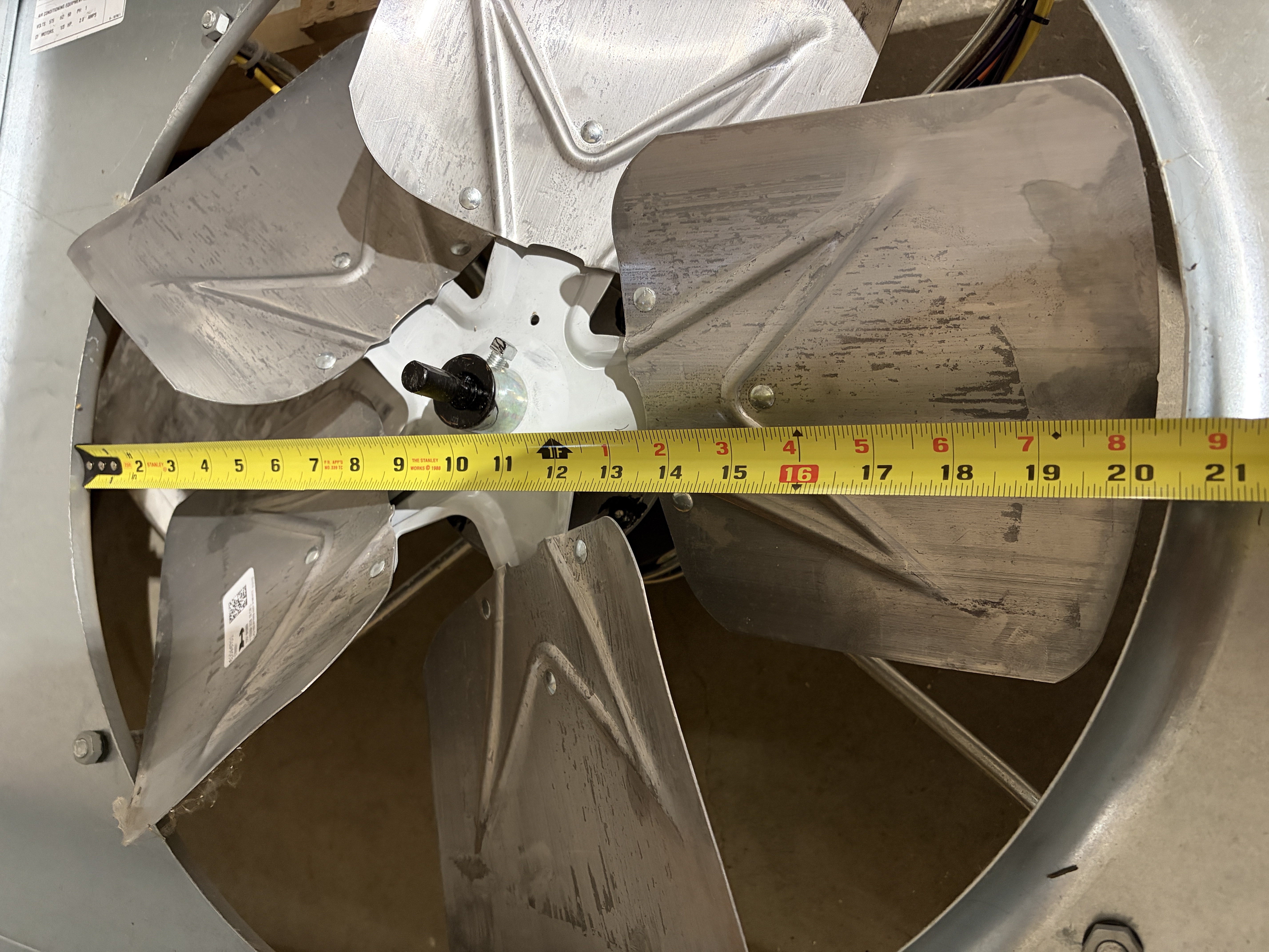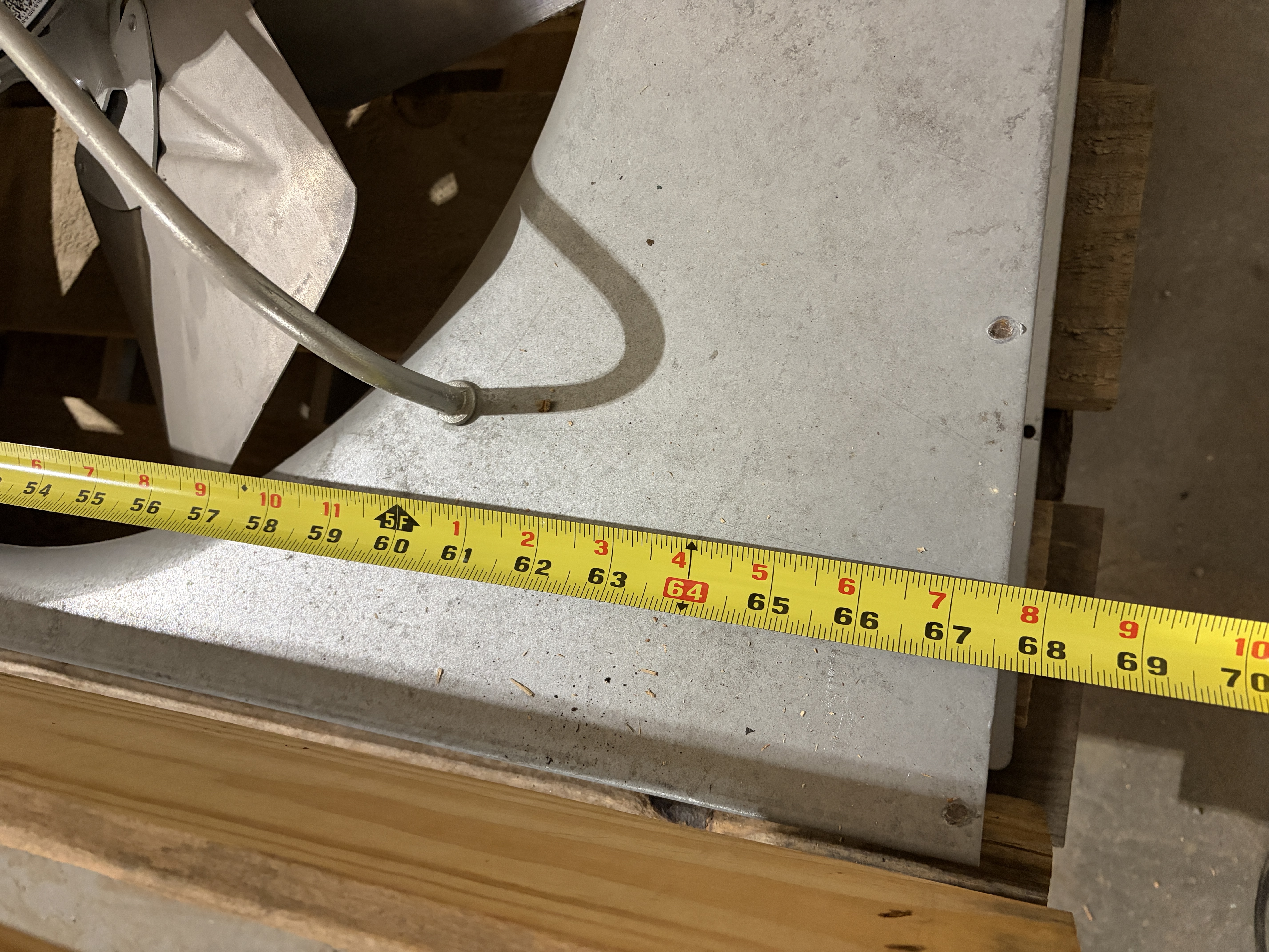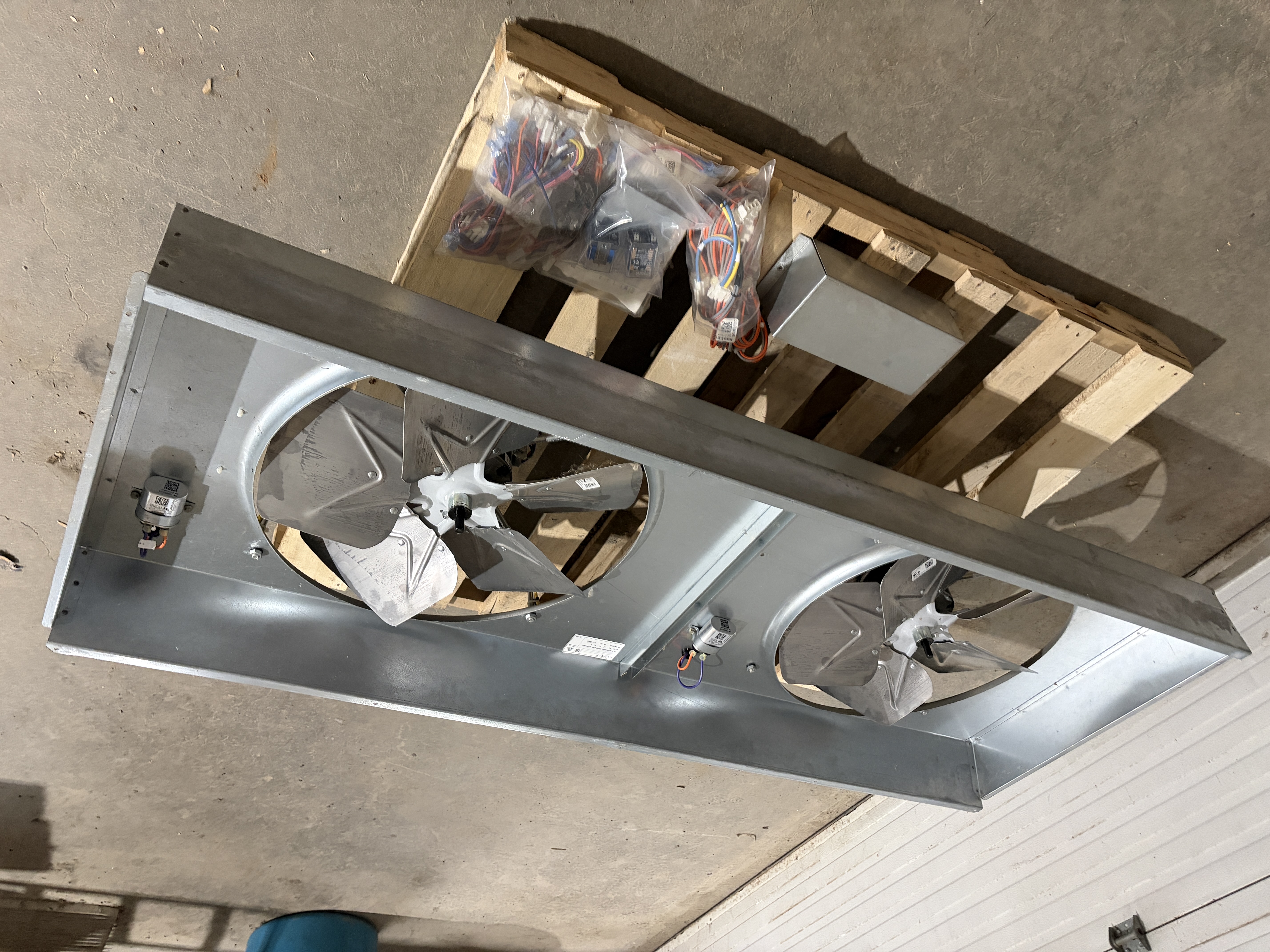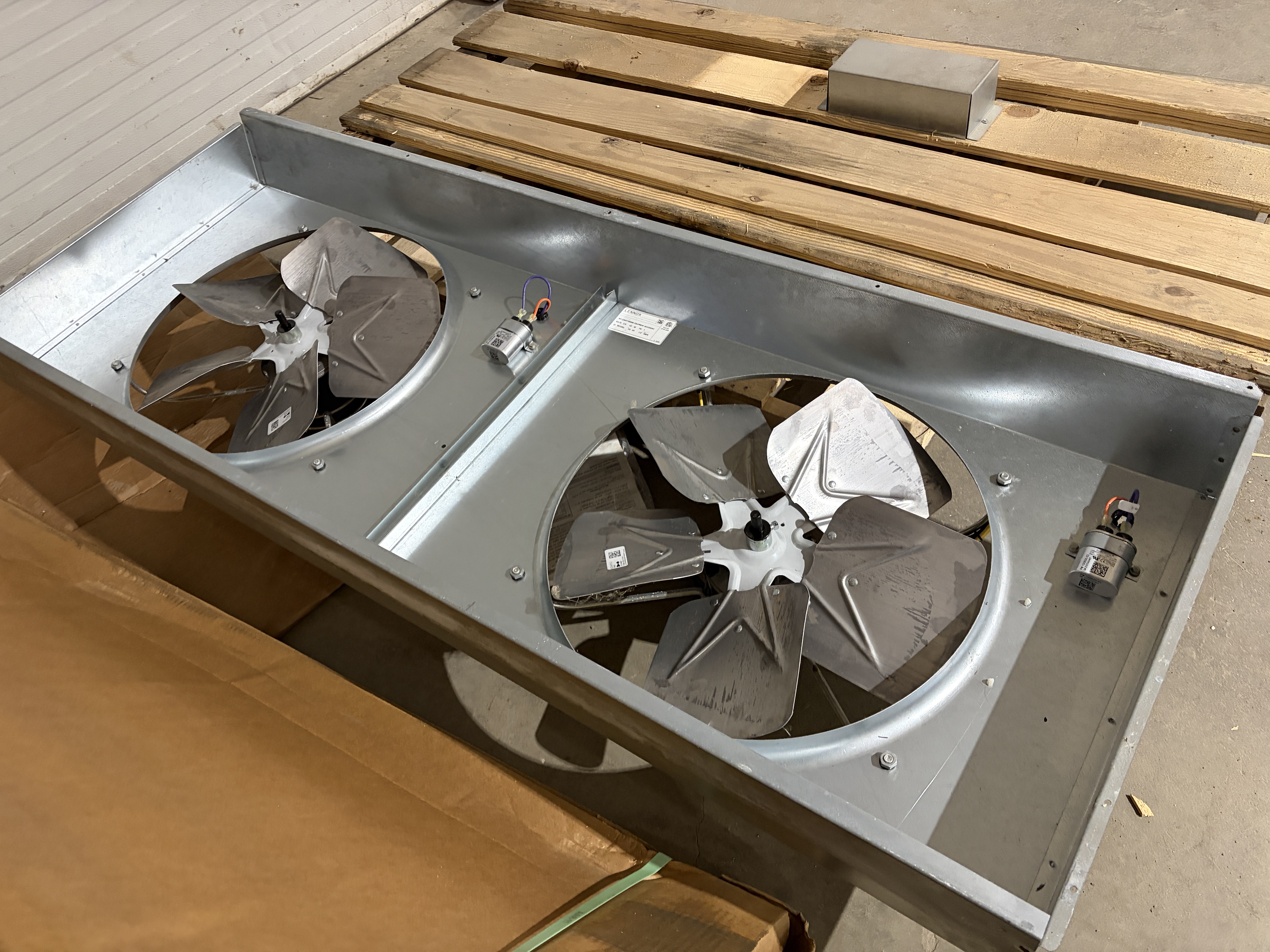 Ventilateur industriel double avec volet. Diamètre: 20 po. Dimension: 68 po 1/2 x 24 po x 5 po 1/2 Voltage: 575 volt. Marque: Lenox.