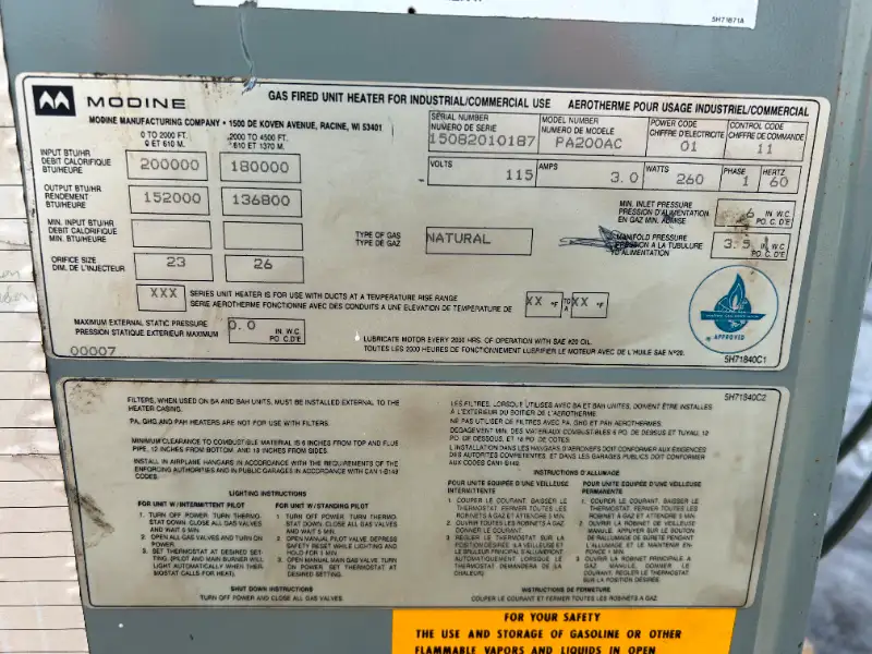 Aérotherme Modine au gaz Dimension: 25''1/2 x 25''3/4 x 40'' de profondeur Moteur: 115 volts