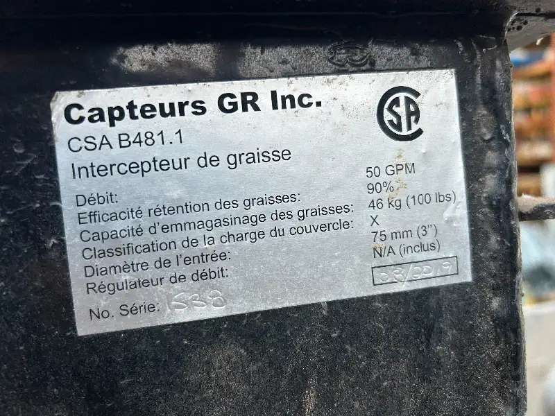 Intercepteur de graisse GR-50 Débit: 50 GPM Efficacité de rétention des graisse: 90% Modèle: GR-50-5355-CS3 Dimension: 32 po x 23 po 1/2 x 24 po de hauteur