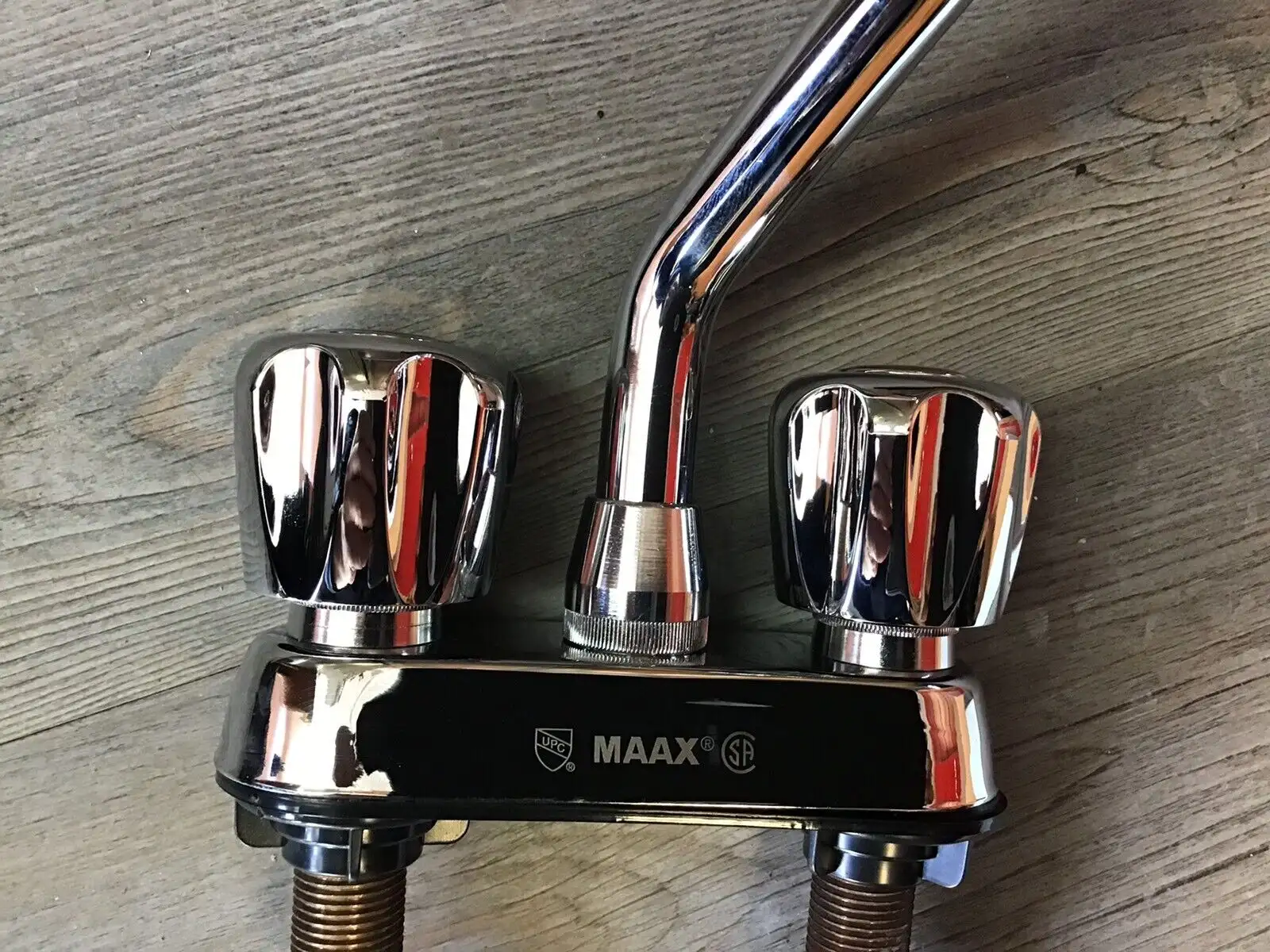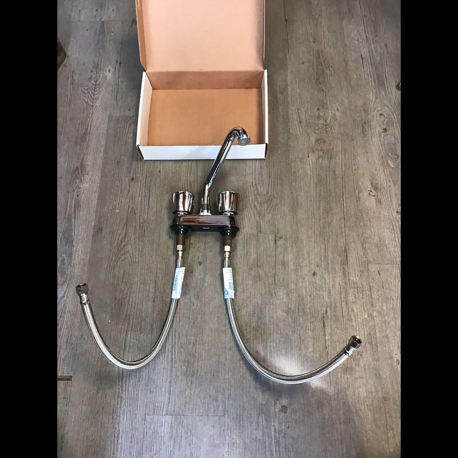 Robinet de marque MAAX (neuf). Vient avec 2 tuyaux flexibles en stainless de 20" de longueur. Distance des trous centre-centre: 4".