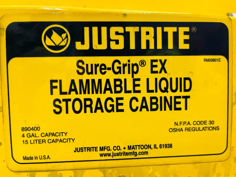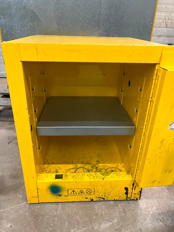 Armoire de sécurité de marque Justrite. Capacité: 4 gallons, 15 litres. Dimensions extérieur: 17" de largeur, 17" de profondeur et 22 1/2" de hauteur. Dimensions intérieur: 13 1/2" de largeur, 14" de profondeur et 18 1/2" de hauteur. 2 Clés incluses.