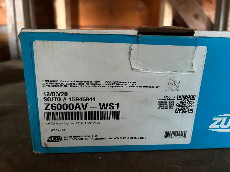 Valve de toilette/flush Marque:Zurn Modèle: Z6000AV-WS1 Capacité: 1.6 gallons par chasse d’eau