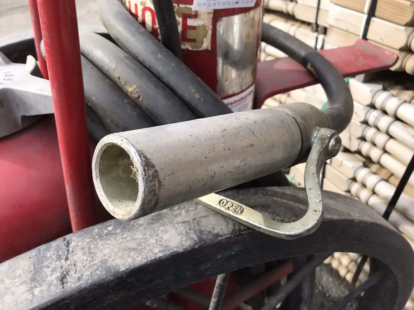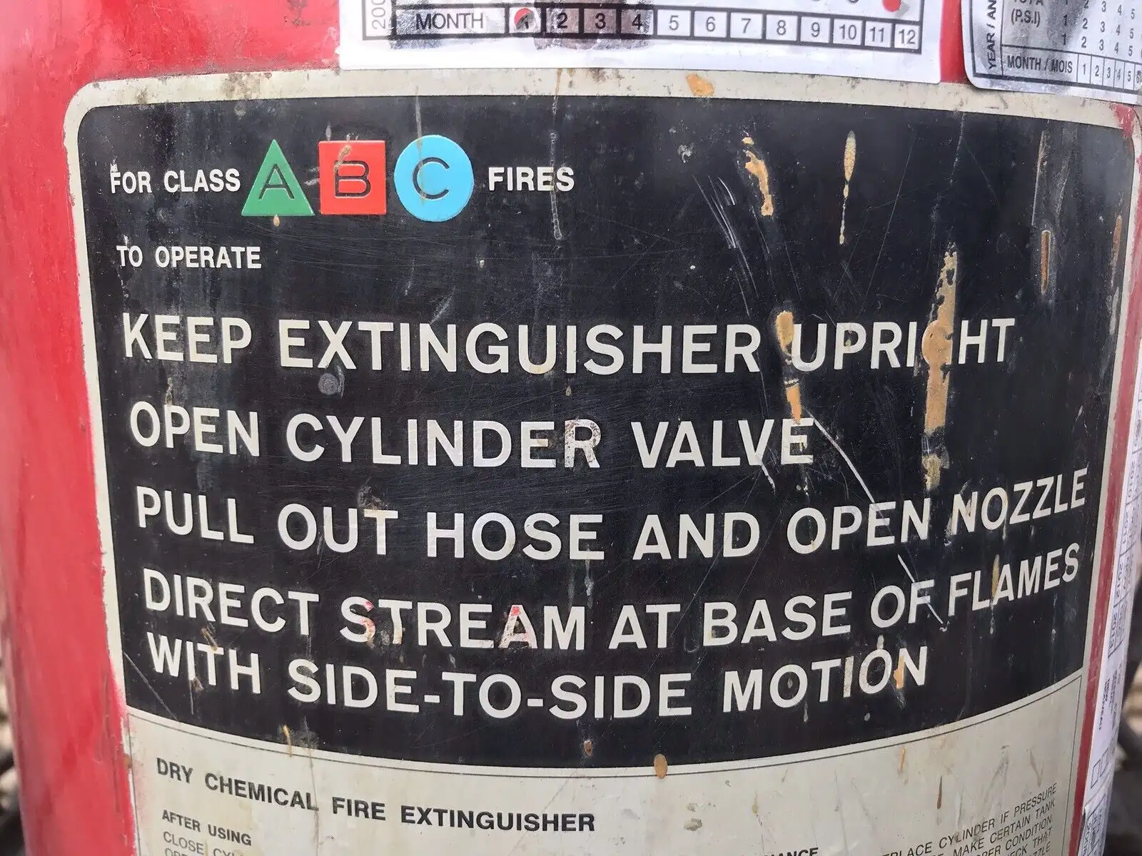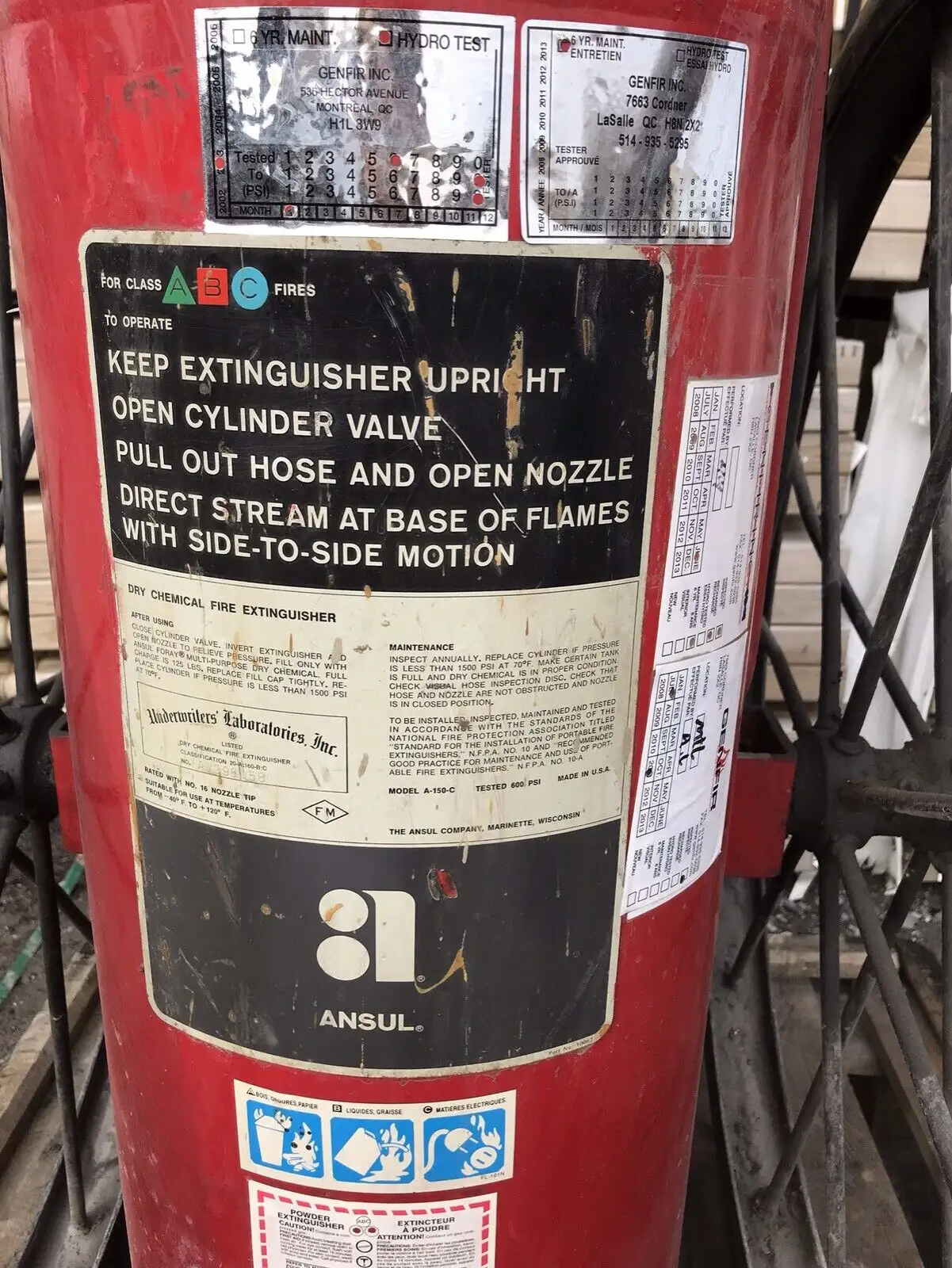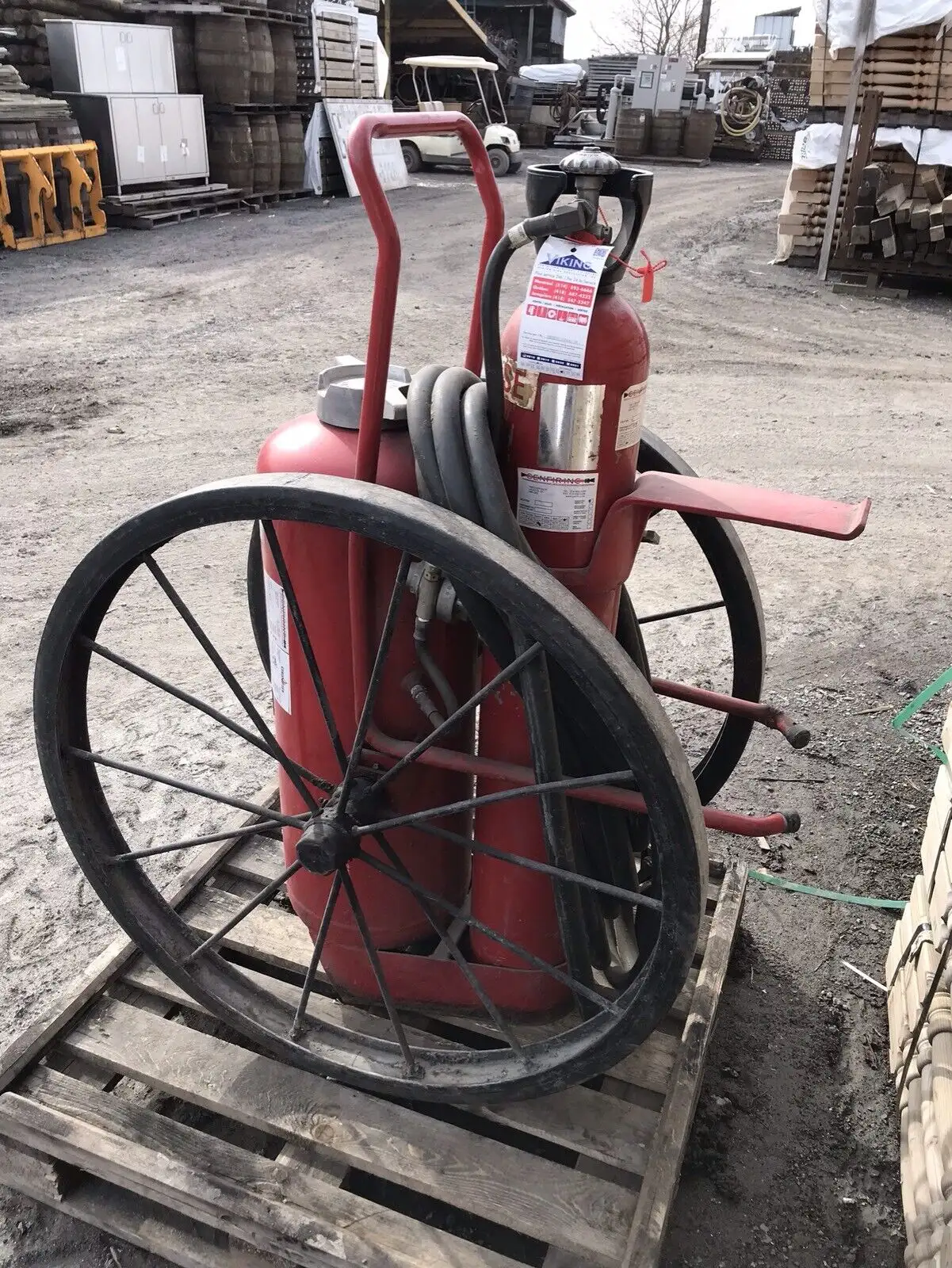 Extincteur antique. 52 po de hauteur, 28 po de largeur. Diamètre des roues: 37 po.