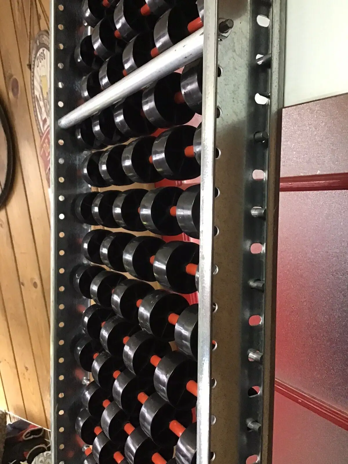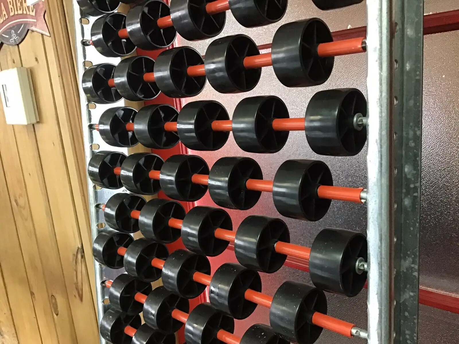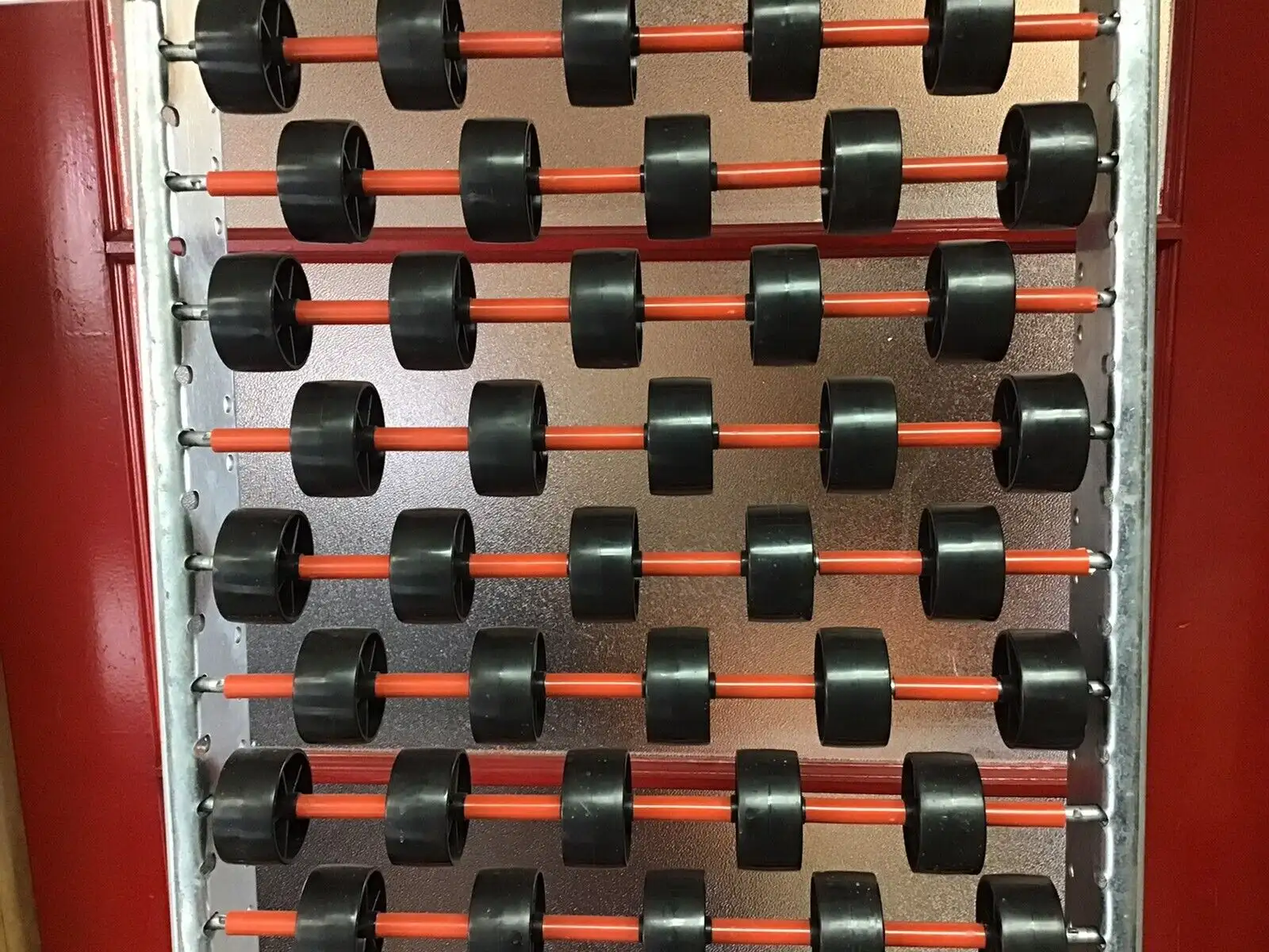 Convoyeur à roulettes avec cadre en acier galvanisé. 15 1/2" de largeur. 89 3/4" de longueur. Les roulettes ont 1 7/8" de diamètre.
