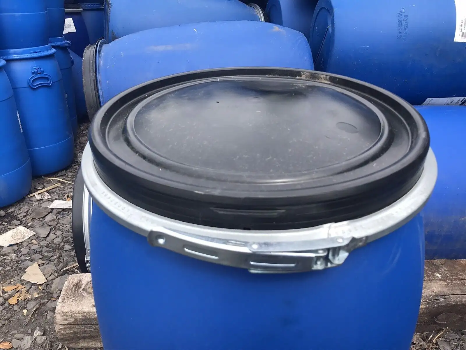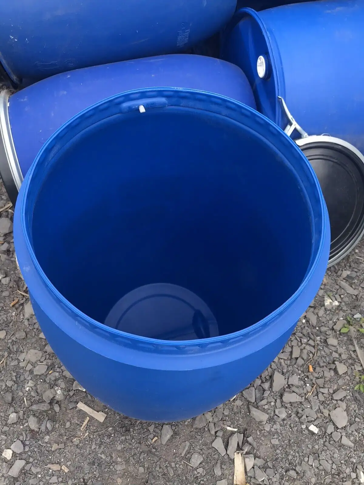 Baril bleu en plastique avec couvercle à clips. Capacité de 110 litres. 20" de diamètre et 31" de hauteur. 15 1/2" d’ouverture.
