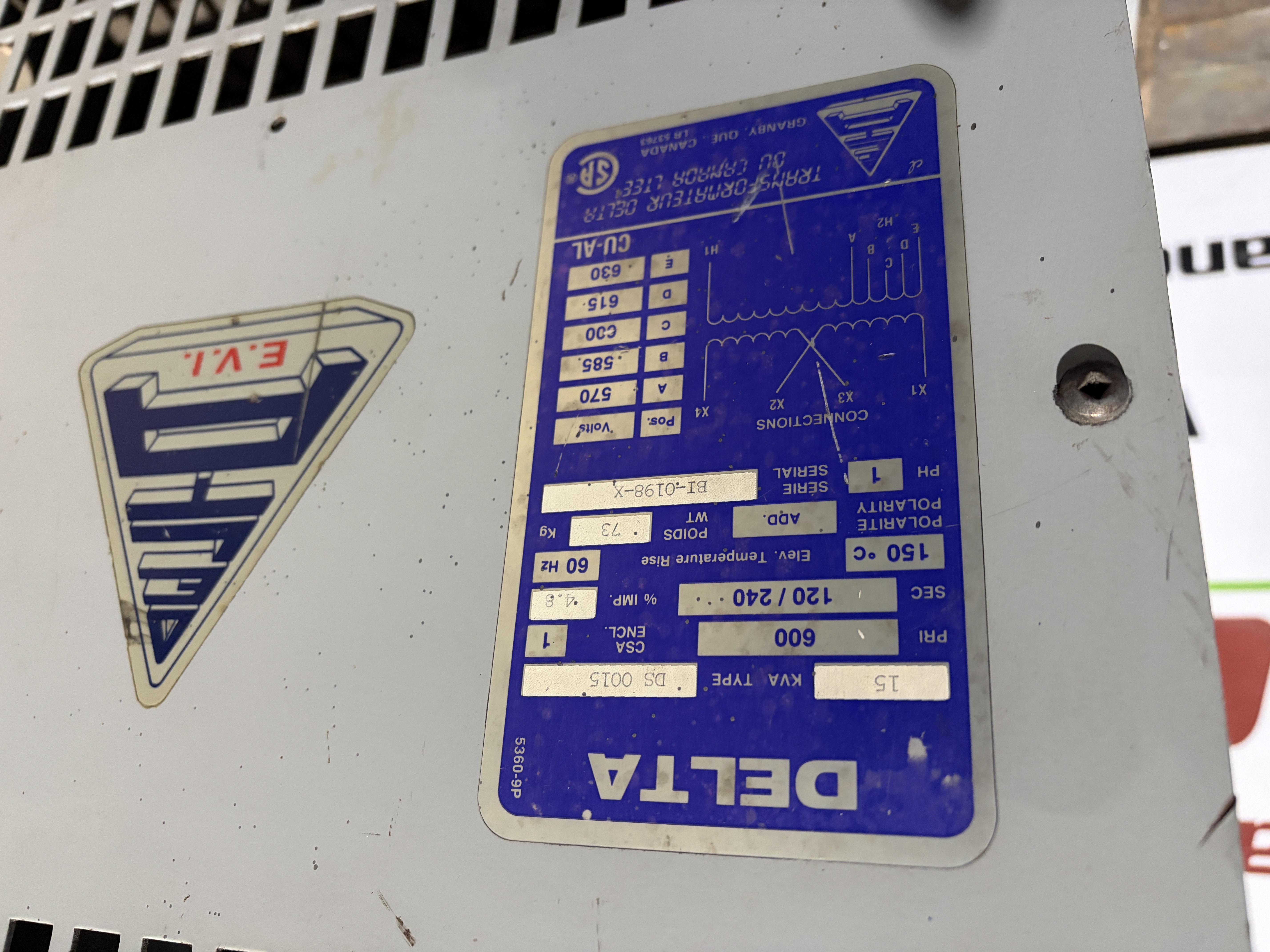 Transformateur Delta 15 kva 600, 120/240, 1 phase