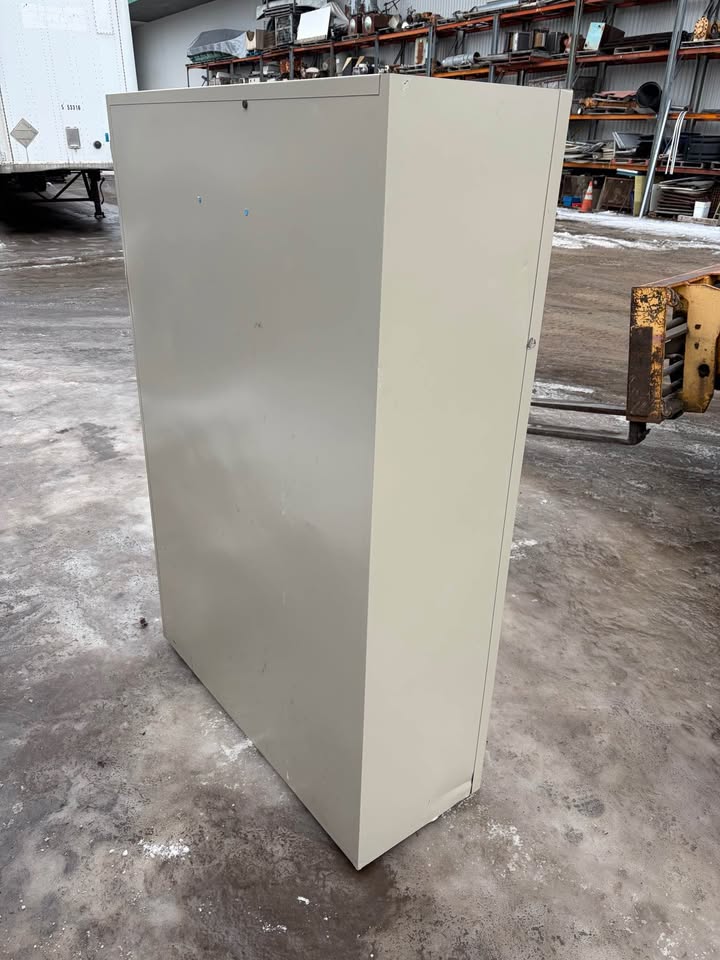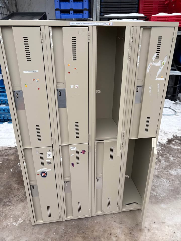 Casier vestiaire 8 demi-portes beige usagé. Dimensions: 18 pouces de profond x 48 pouces de larges X 72 pouces de haut